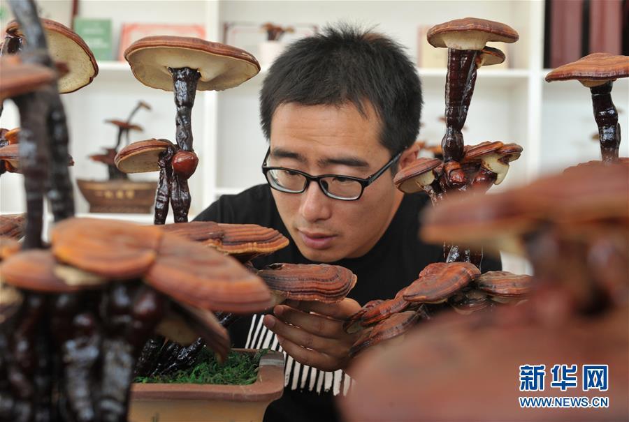 9月4日,韓子夜在靈芝種植園內(nèi)整理靈芝盆景。