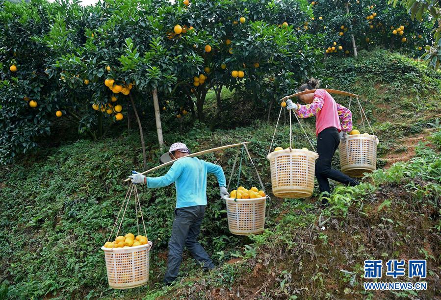 11月11日,江西省尋烏縣澄江鎮(zhèn)周田村的果農(nóng)在挑運臍橙。新華社記者 萬象 攝