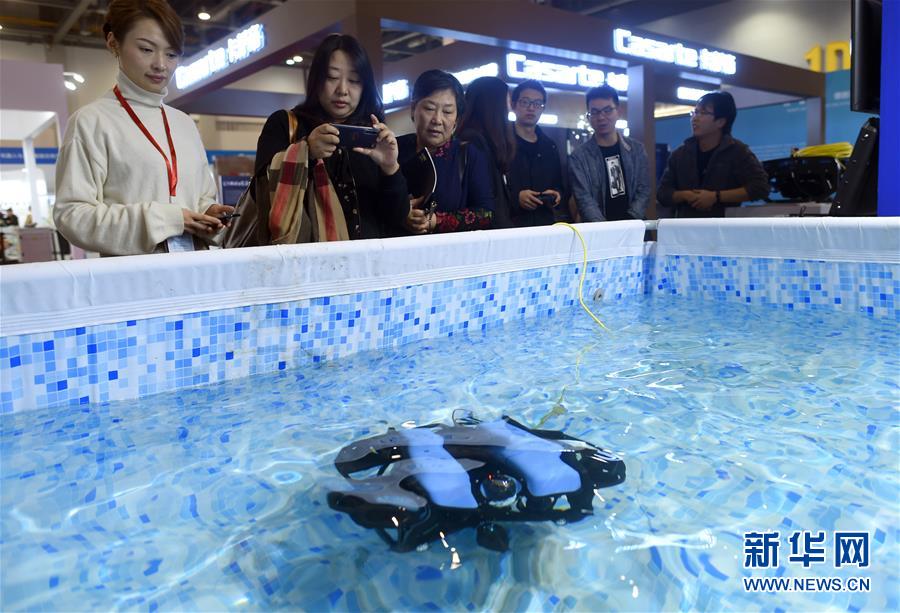 11月10日,人們在展會現(xiàn)場觀看展出的一款小型水下機器人。 新華社記者韓傳號攝