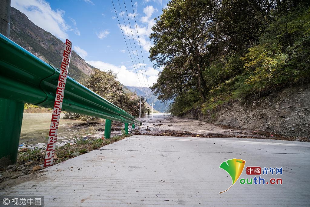 2018年10月18日,通往西藏林芝米林縣加拉村的道路被堰塞湖水淹沒。