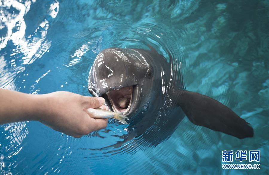 11月10日,中科院水生所武漢白鱀豚館飼養(yǎng)員給長江江豚喂食。