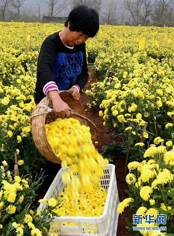 11月14日,在河南省內(nèi)鄉(xiāng)縣乍曲鎮(zhèn)水溝村千畝酈邑貢菊基地,農(nóng)戶將采摘的菊花裝筐。 近年來,河南省內(nèi)鄉(xiāng)縣依托資源優(yōu)勢,把發(fā)展特色農(nóng)業(yè)作為精準(zhǔn)扶貧的重要舉措,采取“公司+合作社+農(nóng)戶”的方式,招引農(nóng)業(yè)龍頭企業(yè)發(fā)展菊花種植產(chǎn)業(yè),把菊花加工成茶飲、藥材等高附加值產(chǎn)品,累計(jì)帶動150余戶貧困戶就業(yè)增收。 新華社記者 李安 攝