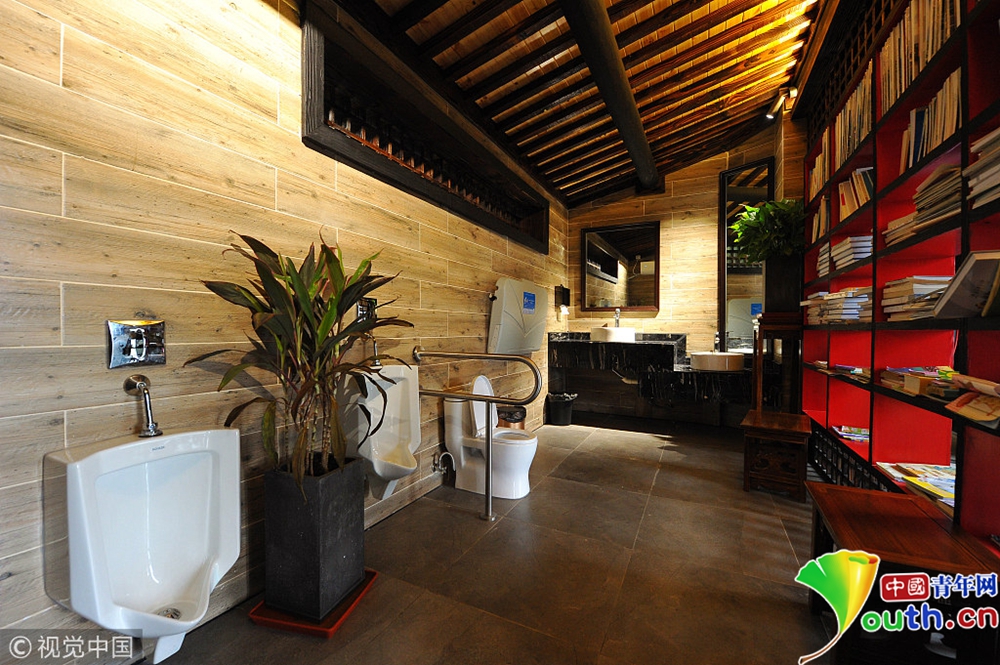 繞過“龍司”外的游廊,迎面是寬敞的古建筑廳堂,擺放中式桌椅,可供游人休息,周瑜、大小喬等東吳人物成為廁所男女標志,廁所內(nèi)花木環(huán)繞,清新淡雅,巧妙的通風設計讓人聞不到一絲異味。最有特色的是,詩詞書畫、特色工藝品等都進入了這個特殊空間,讓游客在解決生理需求外還可以在這里閱讀休息,體驗塘里的鄉(xiāng)土文化。