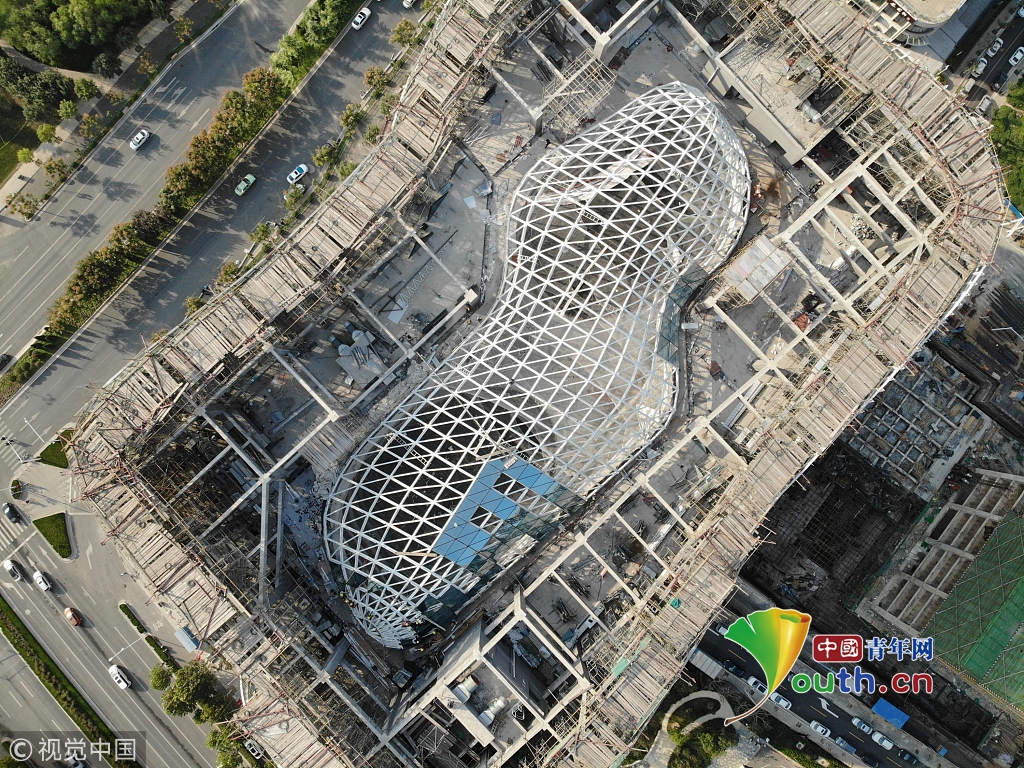 2018年10月13日,河南鄭州,龍子湖湖心島上的一棟在建大樓頂部設計為鏤空的框架結構,俯瞰酷似一顆巨大的花生。