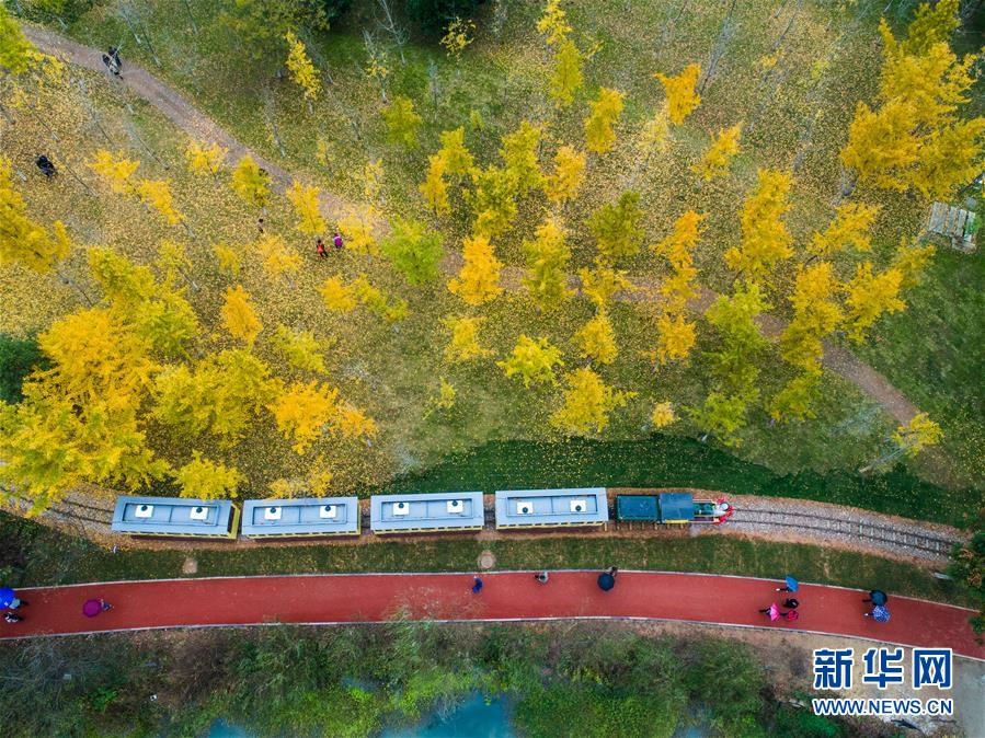 一列觀光小火車帶著游客穿行在銀杏林和花海之間(11月16日無人機拍攝)。近日,在浙江省長興縣小浦鎮(zhèn),“十里銀杏長廊”和近千畝花海經過近一年的升級改造后,以嶄新的面貌與游客見面。花海、觀光小火車、古村民宿、銀杏長廊等旅游項目全面提升了小浦鎮(zhèn)鄉(xiāng)村旅游的品質。新華社記者 徐昱 攝