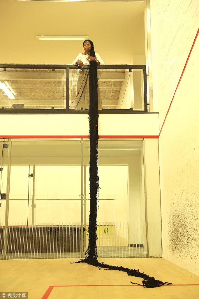 當地時間2018年9月14日,英國韋靈伯勒,正在英國旅行的Asha Mandela來自美國佛羅里達州,是世界上頭發(fā)最長的女人。