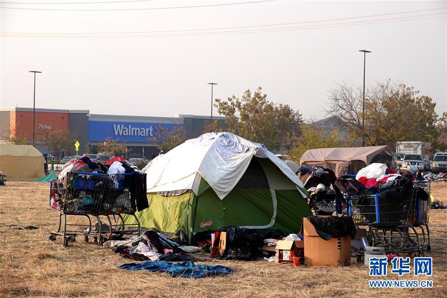 11月18日,在美國加利福尼亞州比尤特縣奇科,災民在沃爾瑪停車場搭起帳篷暫居。 新華社記者吳曉凌攝