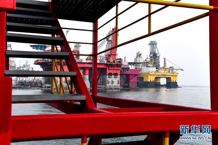 中集來福士海洋工程有限公司煙臺基地深水碼頭停放的半潛式鉆井平臺(11月14日攝)。新華社記者郭緒雷攝