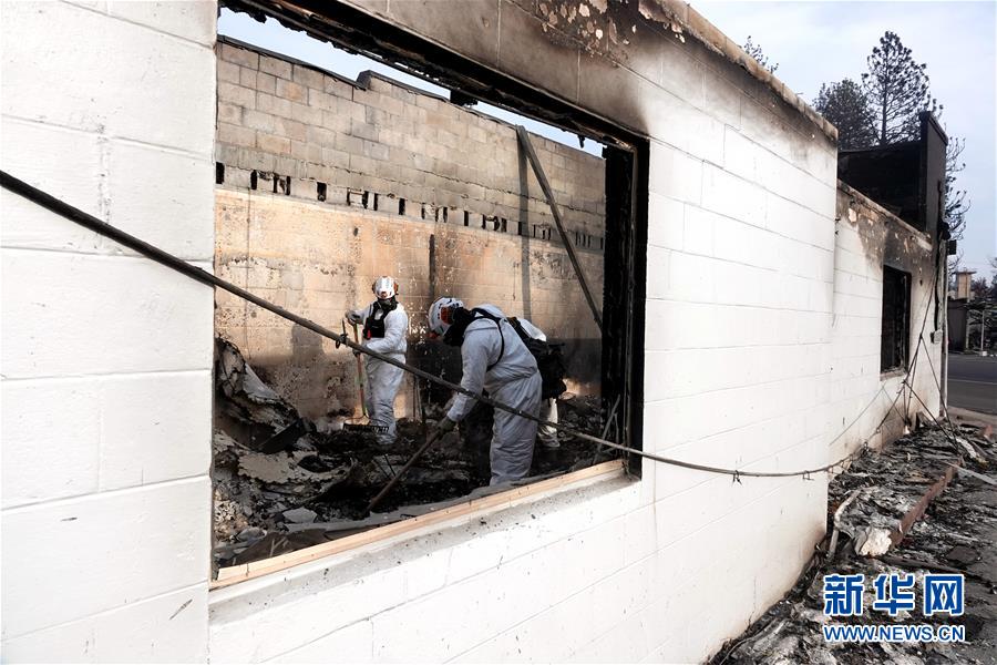11月20日,在美國加利福尼亞州比尤特縣天堂鎮(zhèn),救援人員在災(zāi)區(qū)工作。