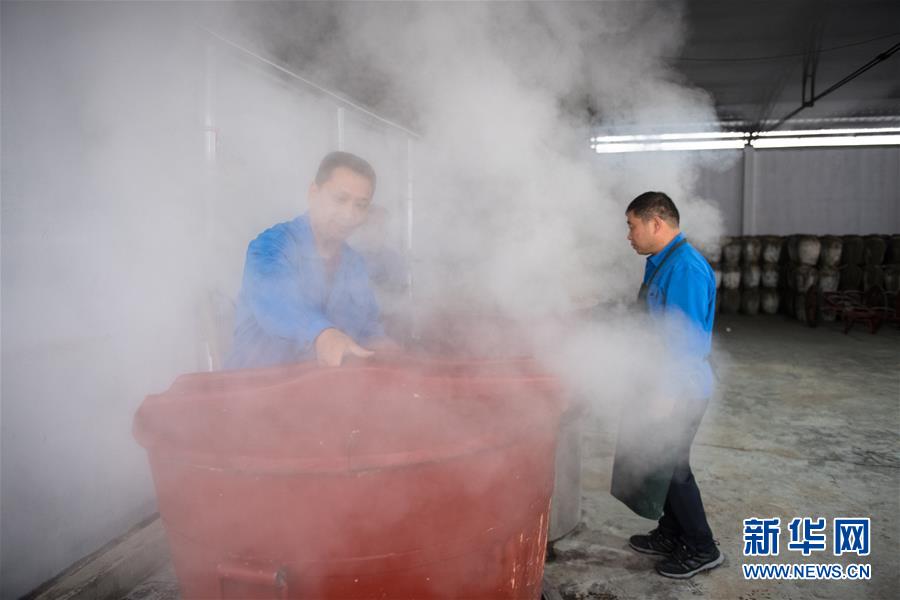 11月21日,工作人員在紹興女兒紅釀酒有限公司廠房蒸煮糯米。 浙江紹興一帶有“生女釀好酒、婚嫁宴賓客”的習(xí)俗,所釀之酒稱“女兒紅”。在紹興市上虞區(qū)東關(guān)街道,一家釀酒廠仍保留著傳統(tǒng)的黃酒生產(chǎn)線,恪守著近20道釀造工序,延續(xù)著傳統(tǒng)黃酒的釀制技藝和生女必釀“女兒紅”的文化習(xí)俗。 黃酒是中國(guó)最古老的酒種之一,傳統(tǒng)黃酒僅在冬季取鑒湖水和糯米釀制,所得之酒澄澈馥郁。 新華社記者翁忻旸攝