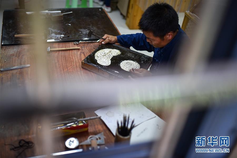 龍懂陽的弟弟龍?zhí)栆彩倾y飾工藝傳人。和哥哥不同,弟弟主打的是銀飾文化體驗游,用自家傳統(tǒng)苗寨開設(shè)民宿,游客在此居住的同時,還能學(xué)習(xí)體驗銀飾品制作。每年暑期一到,家長孩子絡(luò)繹不絕。新客源、新銷路、新模式帶動雷山縣銀飾業(yè)不斷發(fā)展壯大,成為脫貧攻堅的重要產(chǎn)業(yè)。2017年,雷山縣控拜、麻料、烏高三個村銀飾品及相關(guān)產(chǎn)業(yè)銷售額超過1.5億元,吸引很多外出打工的年輕人回家創(chuàng)業(yè)。苗寨鍛銀聲在綠水青山間響遍千戶,也漸漸走出大山,聲名遠(yuǎn)播。新華社記者 李芒茫 攝