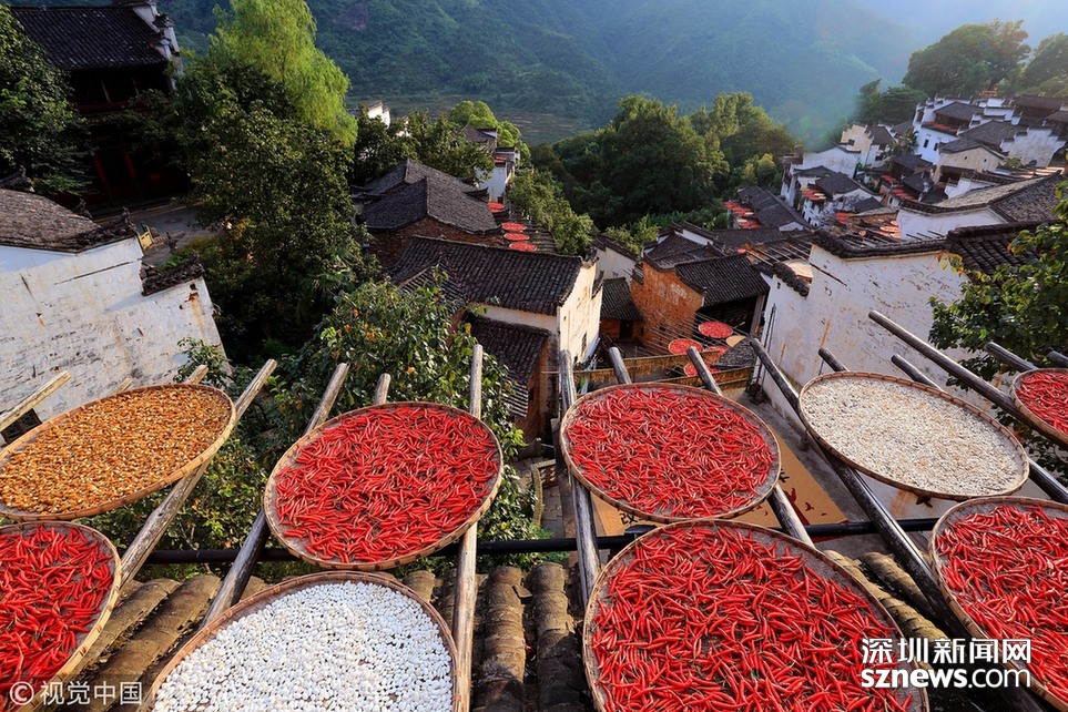 2018年8月7日,江西婺源縣篁嶺古村,壯觀的“曬秋”場景。