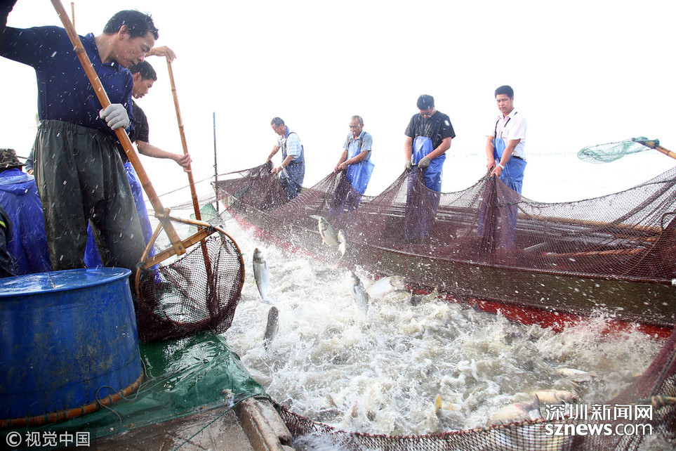 2018年6月26日,江蘇省常州市嘉澤鎮(zhèn)捕撈村的漁民組織夏季捕撈,一網(wǎng)魚(yú)達(dá)五萬(wàn)余斤,以鰱魚(yú)為主,供應(yīng)市場(chǎng)需求。夏捕的魚(yú)價(jià)較平時(shí)有所上漲,漁民粗略估計(jì)可增收上萬(wàn)余元。