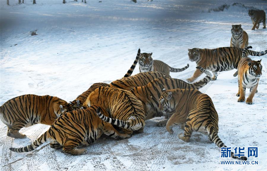 在橫道河子?xùn)|北虎林園散放區(qū),一群東北虎準(zhǔn)備捕食投放的活雞(11月21日攝)。新華社記者王建威攝