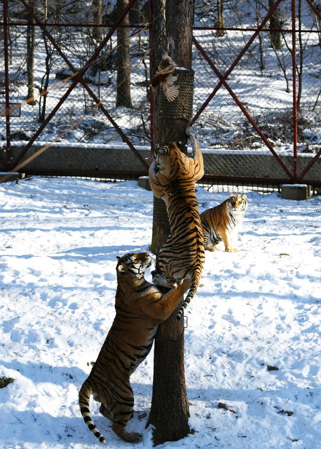 東北虎林園:老虎爬樹抓雞“顯身手”