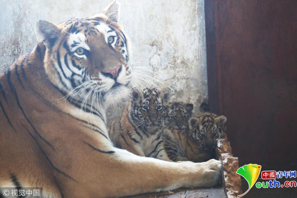 11月23日,出生一個(gè)多月的小東北虎和“虎媽”在一起。位于哈爾濱的黑龍江東北虎林園近日發(fā)布消息,該園2018年繁育計(jì)劃已經(jīng)完成,全年新增東北虎寶寶98只。
