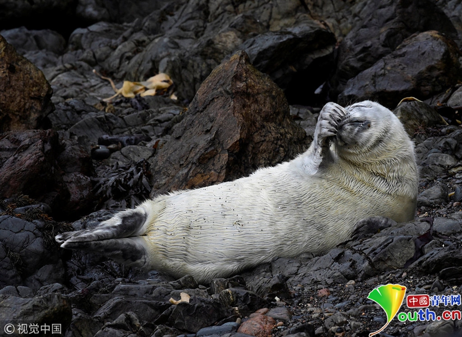中國青年網(wǎng)北京10月9日電 當(dāng)?shù)貢r(shí)間2018年10月8日,英國彭布羅克郡,一只大西洋海豹幼崽躺在海邊礁石上。海豹幼崽出生時(shí)都有毛茸茸的白色非防水皮毛,它們會(huì)在第四周蛻皮。
