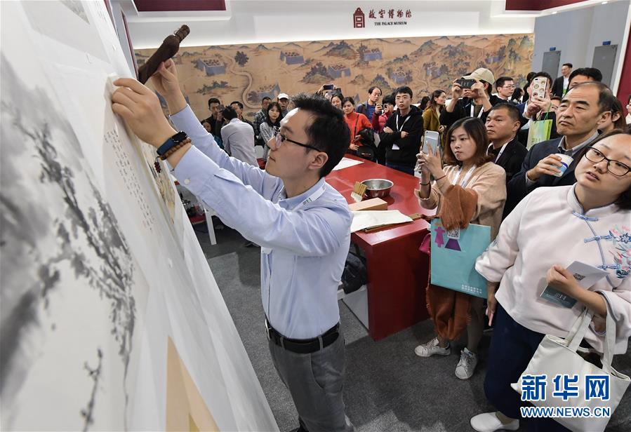 11月23日,參觀者(左一)在中國(guó)文字博物館展臺(tái)前體驗(yàn)?zāi)镜癜嬗∷⒐に?。新華社記者李賀攝