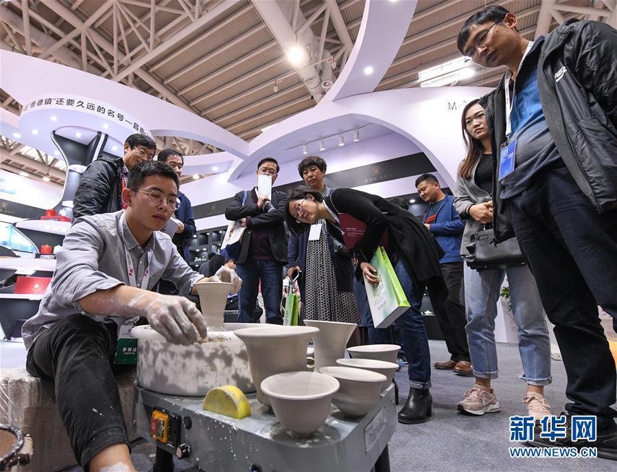 11月23日,景德鎮(zhèn)中國(guó)陶瓷博物館展位上的技師在向參觀者展示瓷器制作中的制坯工藝。新華社記者李賀攝