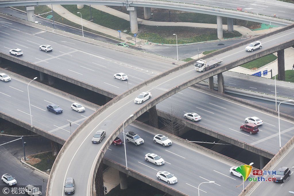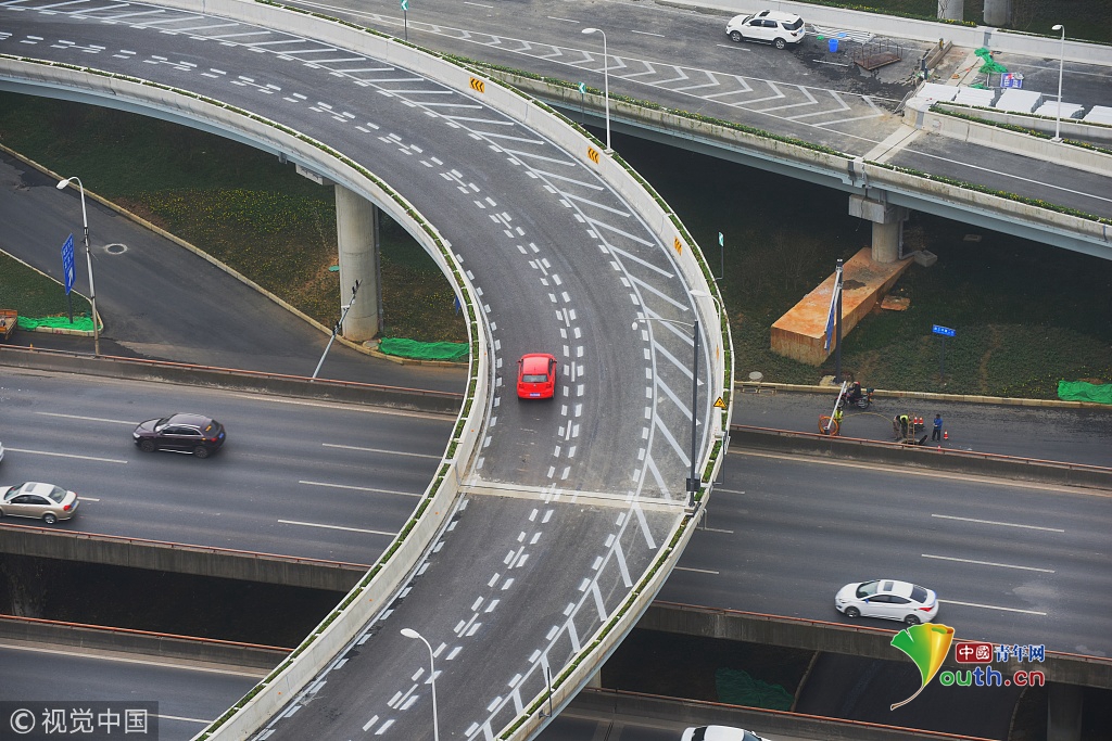 2018年11月23日,成都,俯瞰整個嬌子立交的全貌:12條匝道已經(jīng)完工,道路標(biāo)線、路面路況、指示牌都是全新的,不時有車輛在三環(huán)路和成龍路之間轉(zhuǎn)換。