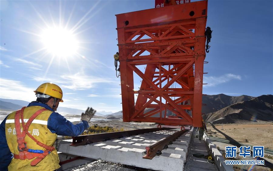 中鐵十一局的工人在川藏鐵路拉林段昌果特大橋進(jìn)行鋪軌作業(yè)(10月16日攝)。 近日,川藏鐵路拉薩至林芝段昌果特大橋開始鋪設(shè)行軌排、架設(shè)梁片,標(biāo)志著川藏鐵路拉林段正式進(jìn)入鋪軌階段。 新華社記者 普布扎西 攝