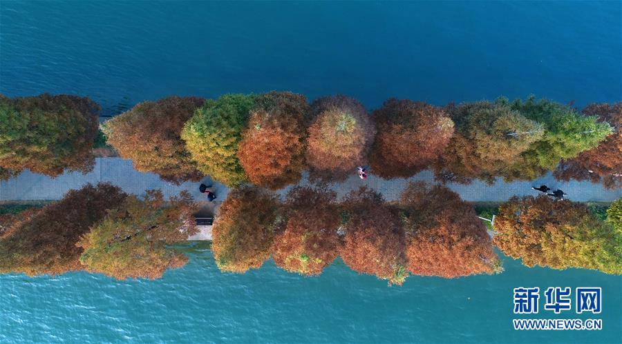 游客行走在湖南烈士公園年嘉湖的游道上(11月25日無(wú)人機(jī)拍攝)。新華社記者 李尕?cái)z