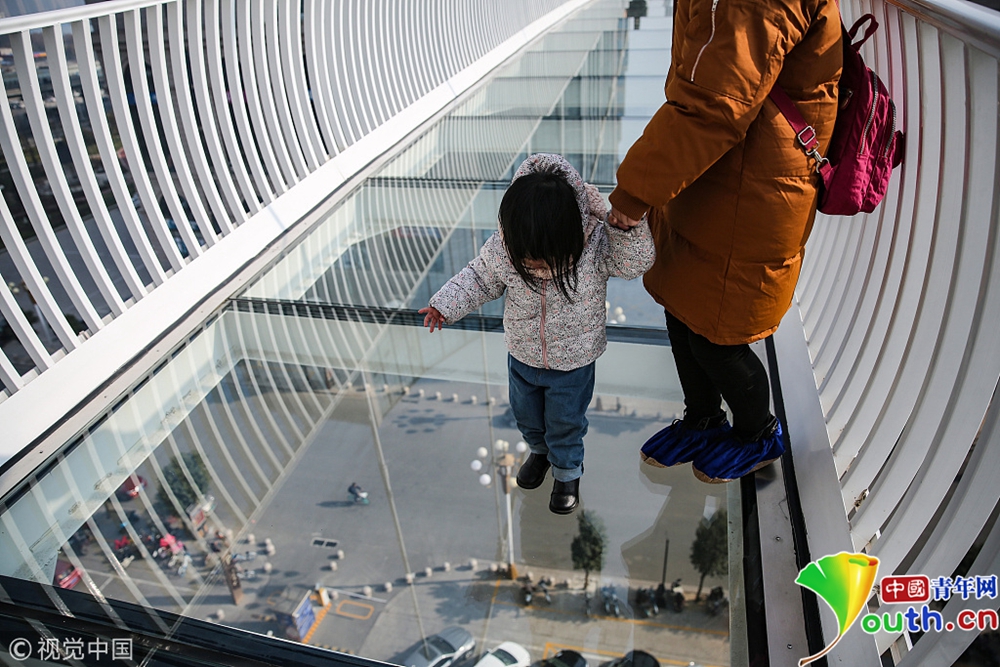 初生牛犢不怕虎,不少兒童走在玻璃吊橋上若無其事,大步流星地往前走,而其身后的家長(zhǎng)則是緊貼著一側(cè)的欄桿,雙手緊握扶手挪步前行,雙眼一直不敢往下看。全程走下了,游客的手掌布滿了冷汗。