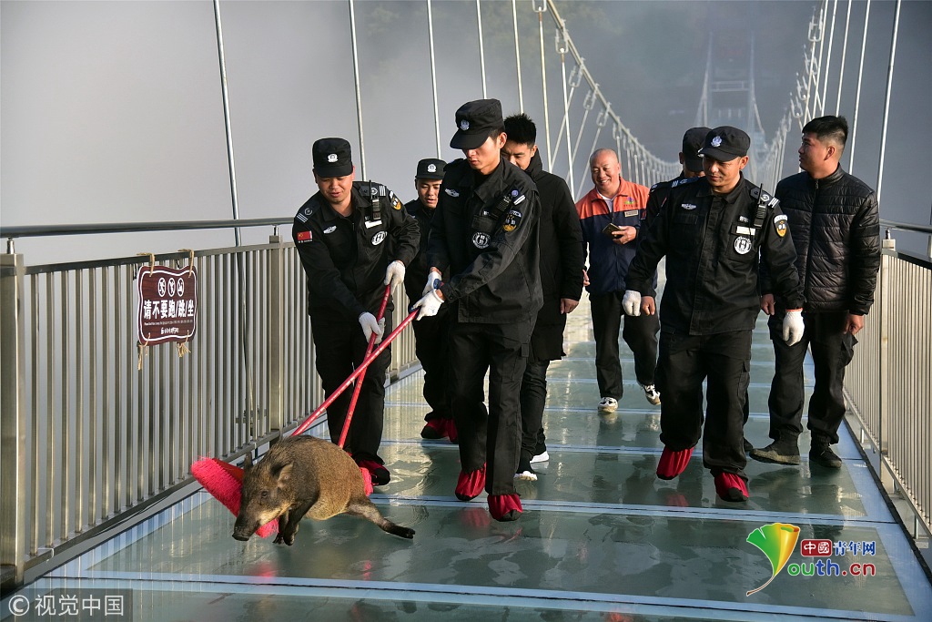 小野豬誤入玻璃橋嚇得發(fā)抖保安解救 豬:你們?nèi)祟愄膳铝?/h1>