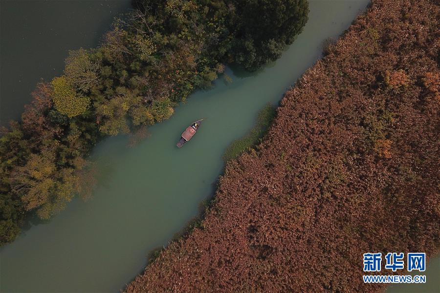 11月30日,游客乘坐搖櫓船在西溪濕地欣賞蘆花(無人機拍攝)。