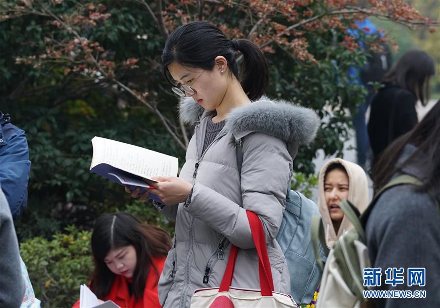 12月2日,在南京林業(yè)大學(xué)考點,一名考生在等候進(jìn)場時復(fù)習(xí)。 新華社記者 孫參 攝