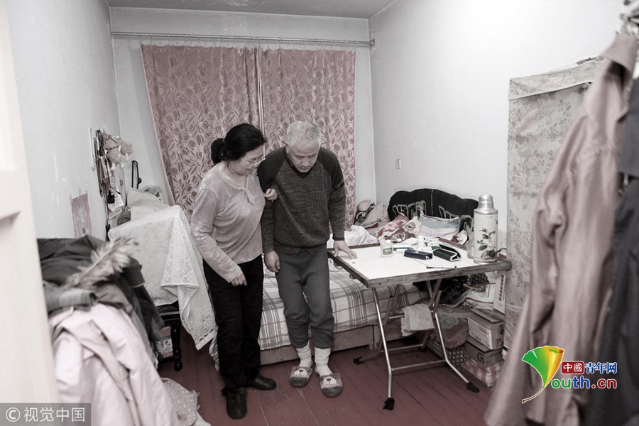 2018年11月22日,遼寧丹東,在出租屋內(nèi),袁東方的母親正在攙扶著老伴兒鍛煉身體。魏建順/視覺中國(guó)