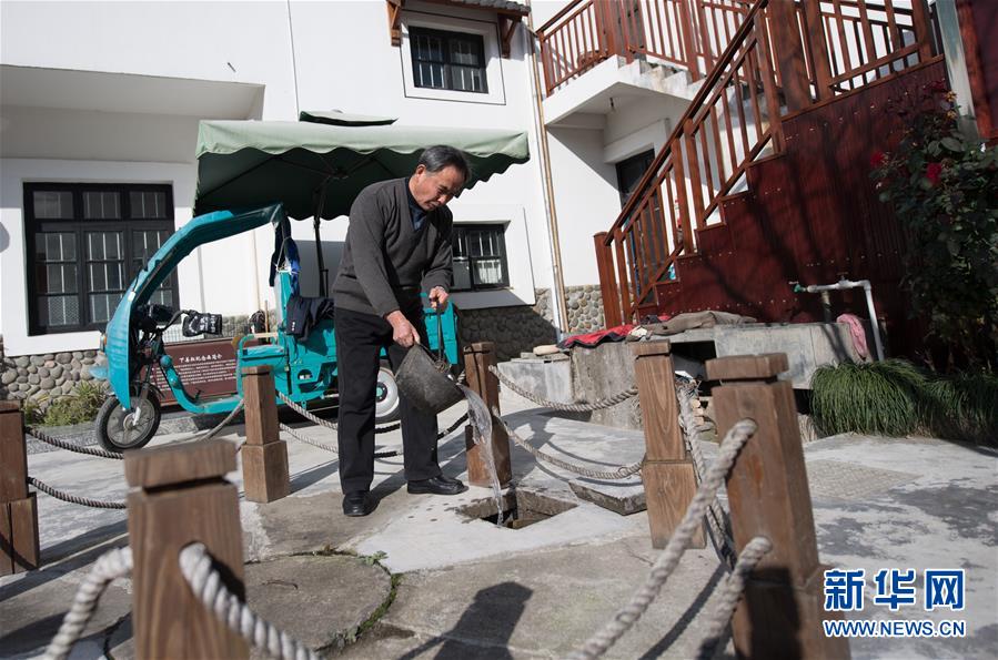 下姜村村民姜祖海給自家沼氣池添水(1月10日攝)。