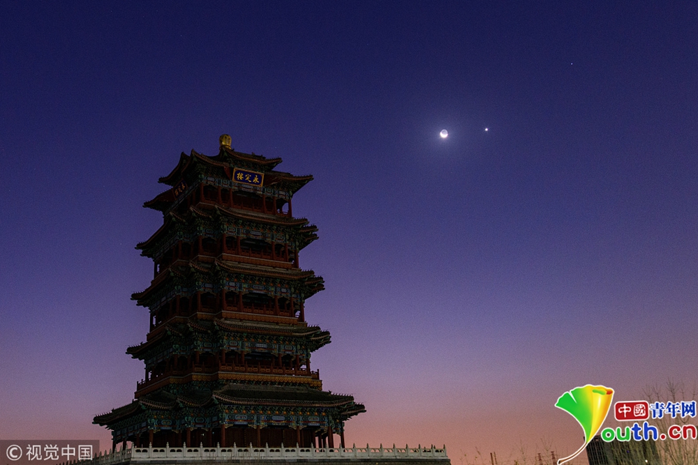2018年12月4日,北京,金星合月天象。金星位于月亮以南3.6度左右的位置上。在這個(gè)時(shí)間附近,以肉眼從地面看去,金星與月亮的二維距離在夜空中看起來是比較接近的,但是在三維空間上,它們的距離是非常遙遠(yuǎn)的(大約6000萬千米)。圖片來源:視覺中國