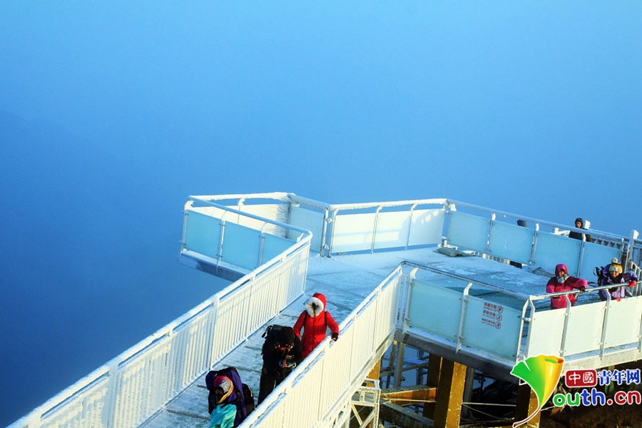 上到金子山最高峰可以看到,玻璃天梯像一條巨龍,沿著金子山最高峰山腰蜿蜒而上,每一個階梯都是玻璃做的,頂上是藍天白云,四周是莽莽群山,天梯下面是深不可測的懸崖絕壁?!?br/>