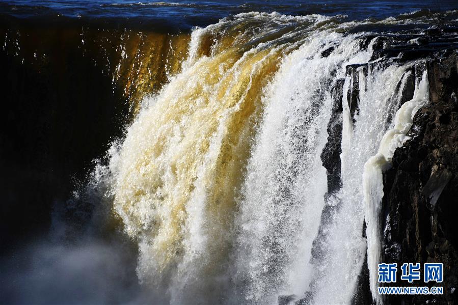 吊水樓瀑布的冬季飛瀑奇觀(12月5日攝)。 受上游來水量大和近期氣溫偏高等因素影響,位于黑龍江東南部的火山堰塞湖——鏡泊湖的吊水樓瀑布水量充沛,展現出飛流直下、水霧升騰的冬季奇觀,引來許多游人觀賞。 新華社記者王建威攝
