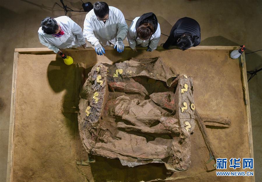 在位于河北行唐的考古實(shí)驗(yàn)室內(nèi),外表裝飾奢華的車廂(俯視)展露“真容”(12月4日攝)。新華社記者 李賀 攝