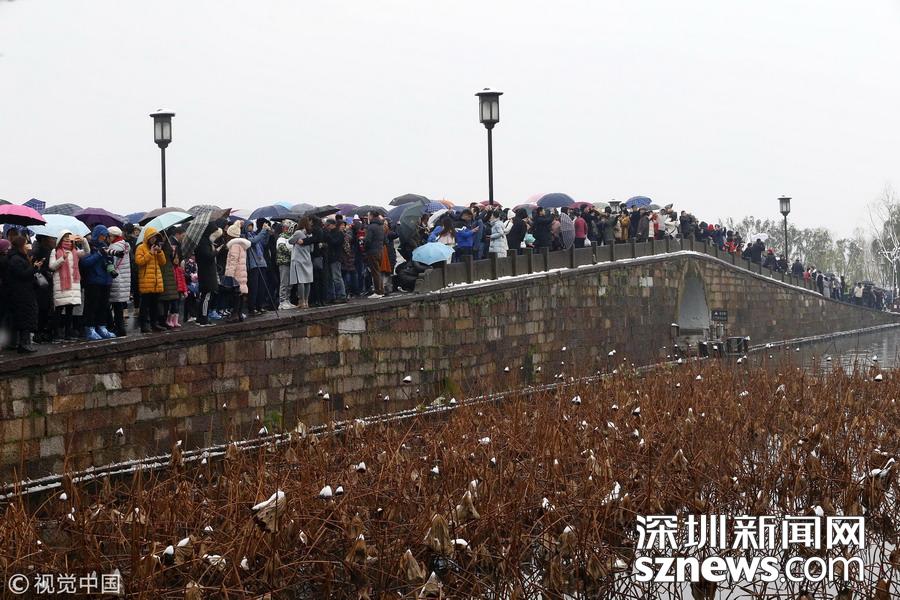 深圳新聞網(wǎng)訊 2018年12月8日,杭州,當(dāng)日市區(qū)普降大雪,市民和游客扎堆涌入西湖景區(qū),拍攝最美雪景照片以及為自己留影。每次杭州一下雪,斷橋便成為眾多游客欣賞雪景、拍攝雪景的地方,大家都想看看“斷橋殘雪”。游客們?cè)延咳霐鄻蚝?,人山人海,讓現(xiàn)場(chǎng)堪比春運(yùn)場(chǎng)景。因?yàn)槿颂?,雪積不起來(lái),斷橋看不到殘雪。