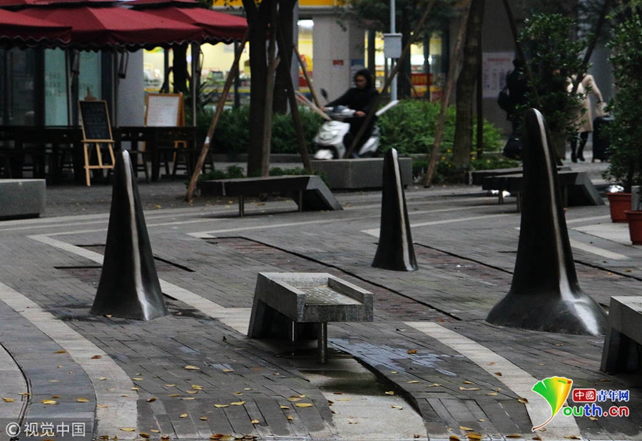2018年11月20日,重慶一園區(qū)內(nèi)馬路中間突出一排“鯊魚鰭”,司機(jī)路人都被“嚇懵”了。突出的鯊魚鰭將兩側(cè)的車行道分開,原來,這是為了進(jìn)一步保證車流的有序進(jìn)出和行人過街安全,同時也為了防止亂停車占用人行道,設(shè)置了這種異形“隔離樁”。圖片來源:視覺中國