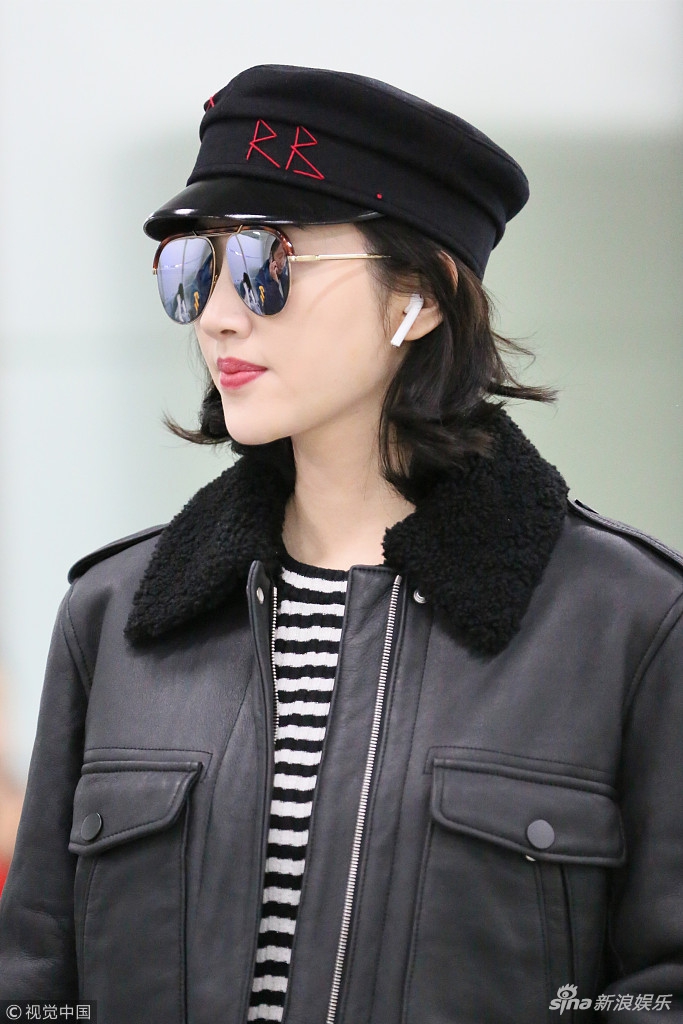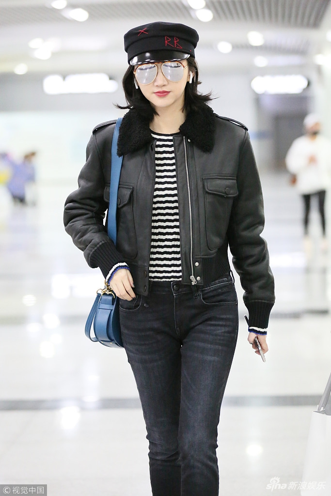 日前,景甜現(xiàn)身機(jī)場,身穿黑色皮夾克超有范兒,戴小帽酷似甜美女軍官。視覺中國/圖