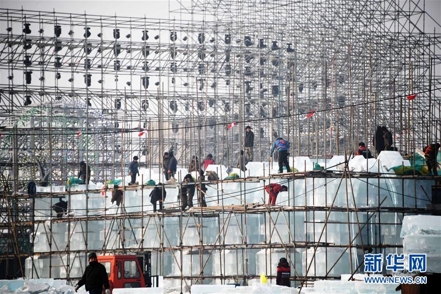 12月13日,工人在第二十屆哈爾濱冰雪大世界園區(qū)施工。新華社記者 王建威 攝