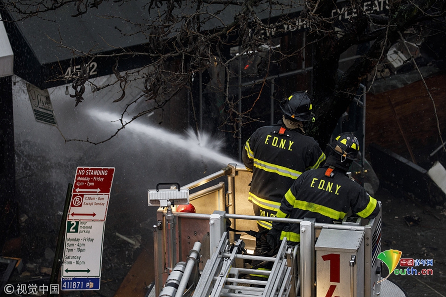 美國紐約,在紐約皇后區(qū)皇后大道,一場(chǎng)大火吞噬了六家商鋪,消防隊(duì)員正在努力撲滅火災(zāi)余燼。十幾人受傷,包括6名消防員。圖片作者:Drew Angerer