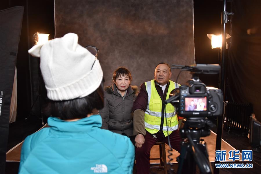 攝影師羅嫻在工地上搭建的臨時(shí)攝影棚內(nèi)指導(dǎo)農(nóng)民工夫妻擺姿勢(shì)(12月10日攝)。 新華社記者 白田田 攝