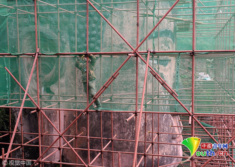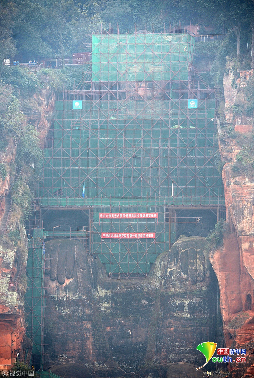 12月10日前后已逐步遮蔽大佛頭部,對頭面部進行勘測;12月底將開始拆除頭部腳手架,保證2019年元旦節(jié)之前,先露出佛頭,供游客觀賞。