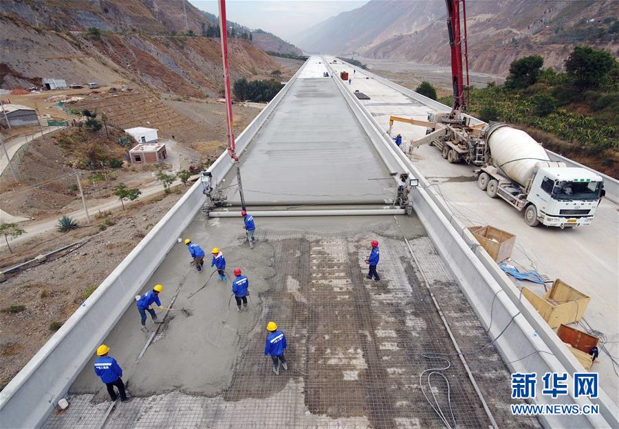 12月15日,中鐵上海局集團(tuán)公司的施工人員在東格高速公路土建項(xiàng)目中進(jìn)行橋面鋪裝作業(yè)(無人機(jī)拍攝)。 新華社記者楊宗友攝
