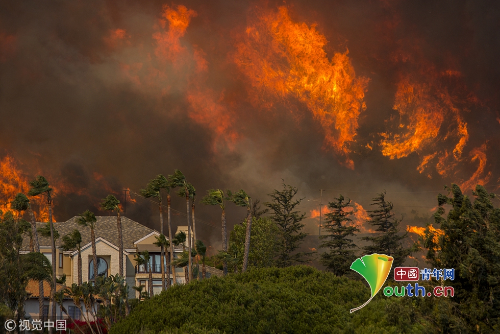 山火迅速蔓延至剛剛發(fā)生槍擊案的千橡樹(shù)市,并在9日翻過(guò)圣莫妮卡山,在強(qiáng)風(fēng)的助力下向海邊蔓延。