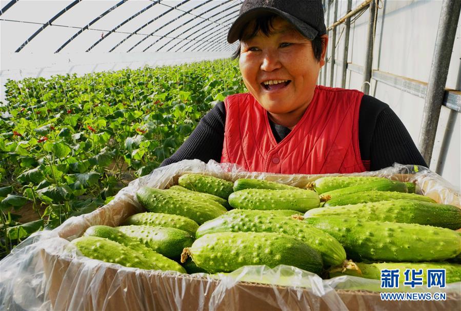 12月15日,唐山市曹妃甸區(qū)一家生態(tài)園的工人在展示剛采摘的黃瓜。 新華社記者 楊世堯 攝