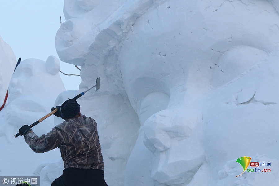 國(guó)內(nèi)最大的雪雕盛會(huì)太陽(yáng)島雪博會(huì)正在緊鑼密鼓建設(shè)中,部分雪雕雛形已現(xiàn),雪雕師正在精雕細(xì)刻打磨中。