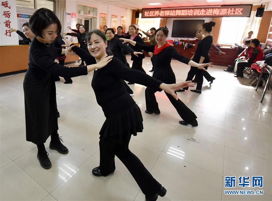 12月17日,豐臺區(qū)東高地街道日間照料中心的舞蹈老師在梅源社區(qū)組織老年人開展舞蹈訓(xùn)練。 新華社記者 李欣 攝