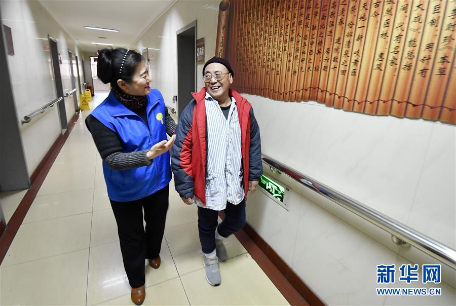 12月17日,豐臺(tái)區(qū)長(zhǎng)辛店街道車(chē)輛廠社區(qū)養(yǎng)老服務(wù)驛站的員工陪同她們通過(guò)“連心通”救助的突發(fā)疾病獨(dú)居老人連鐵良(右)做康復(fù)。 新華社記者 李欣 攝