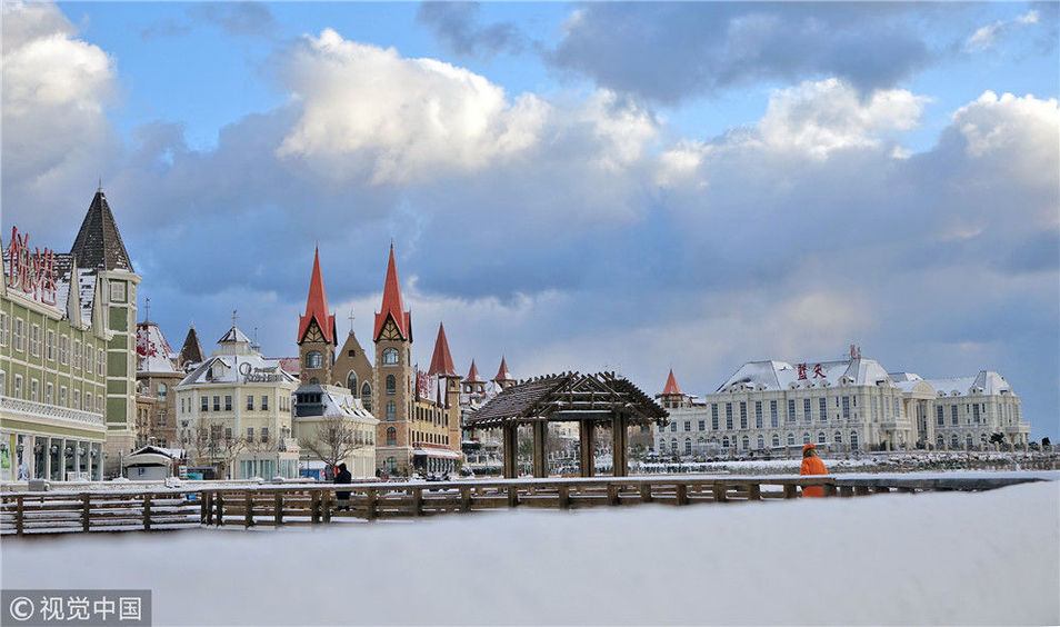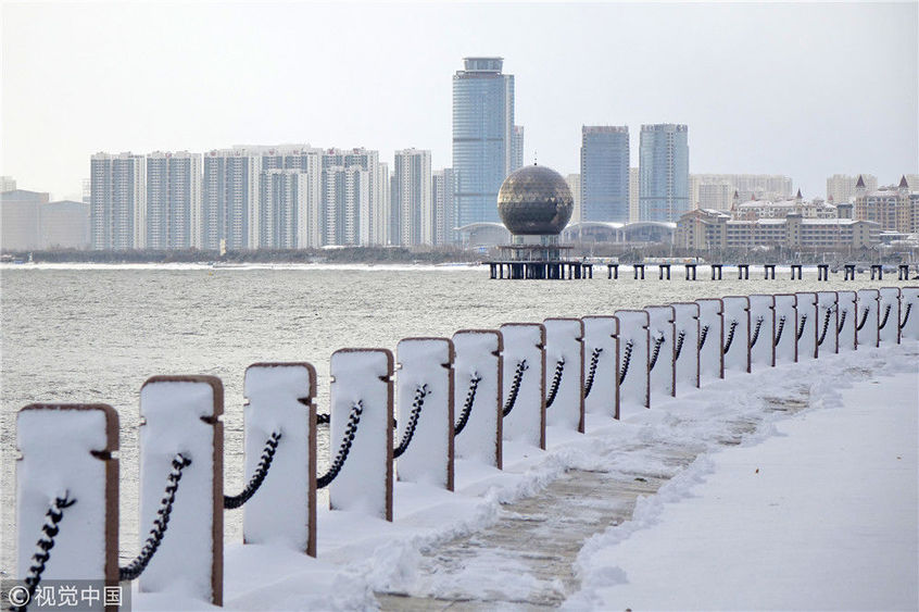 2018年12月7日,山東煙臺(tái),雪后的海濱景色。當(dāng)日煙臺(tái)迎來今冬首場降雪,海濱建筑在大雪的裝點(diǎn)下,形成海濱城市獨(dú)有的美麗雪景。地處膠東半島的煙臺(tái),冬季降雪量遠(yuǎn)高于地理位置相近的其他地區(qū),形成了獨(dú)特的海濱雪城,是中國著名的“雪窩”。唐克/視覺中國